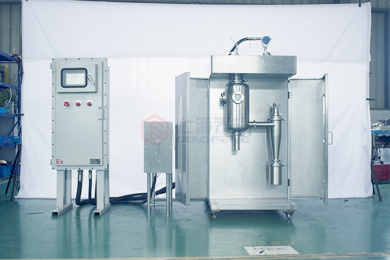 制药实验室科研用小型闭式喷雾干燥机 防爆型,装置特别针对于有机溶剂,以使用循环氮气而形成的惰性气体介质取代通常的空气介质,来进行喷雾干燥。除了能回收产品之外,尚可回收有机溶剂。针对有机溶剂低闪点或者微毒的特点,易燃易爆的特点特别设计该套闭式循环喷雾系统。